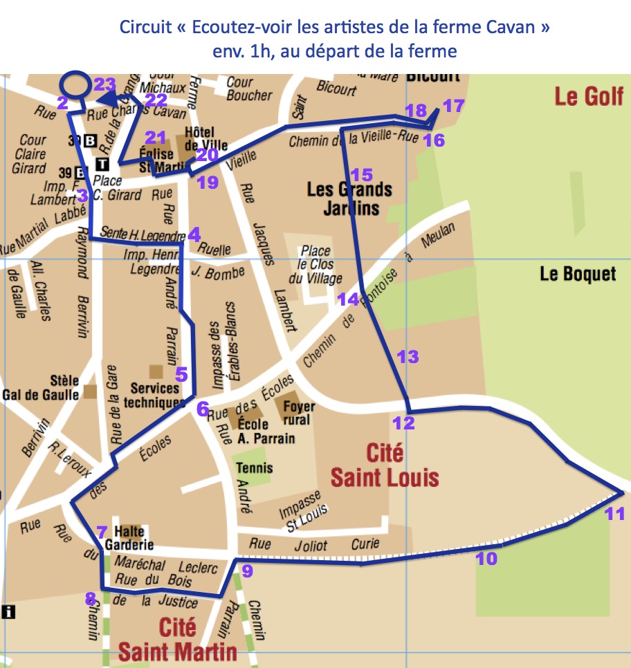 Le départ de la promenade se fait dos à la porte de la cuisine de la résidence d’artistes de la Ferme Cavan qui se situe au 3 rue Charles Cavan à Courdimanche (95800).
